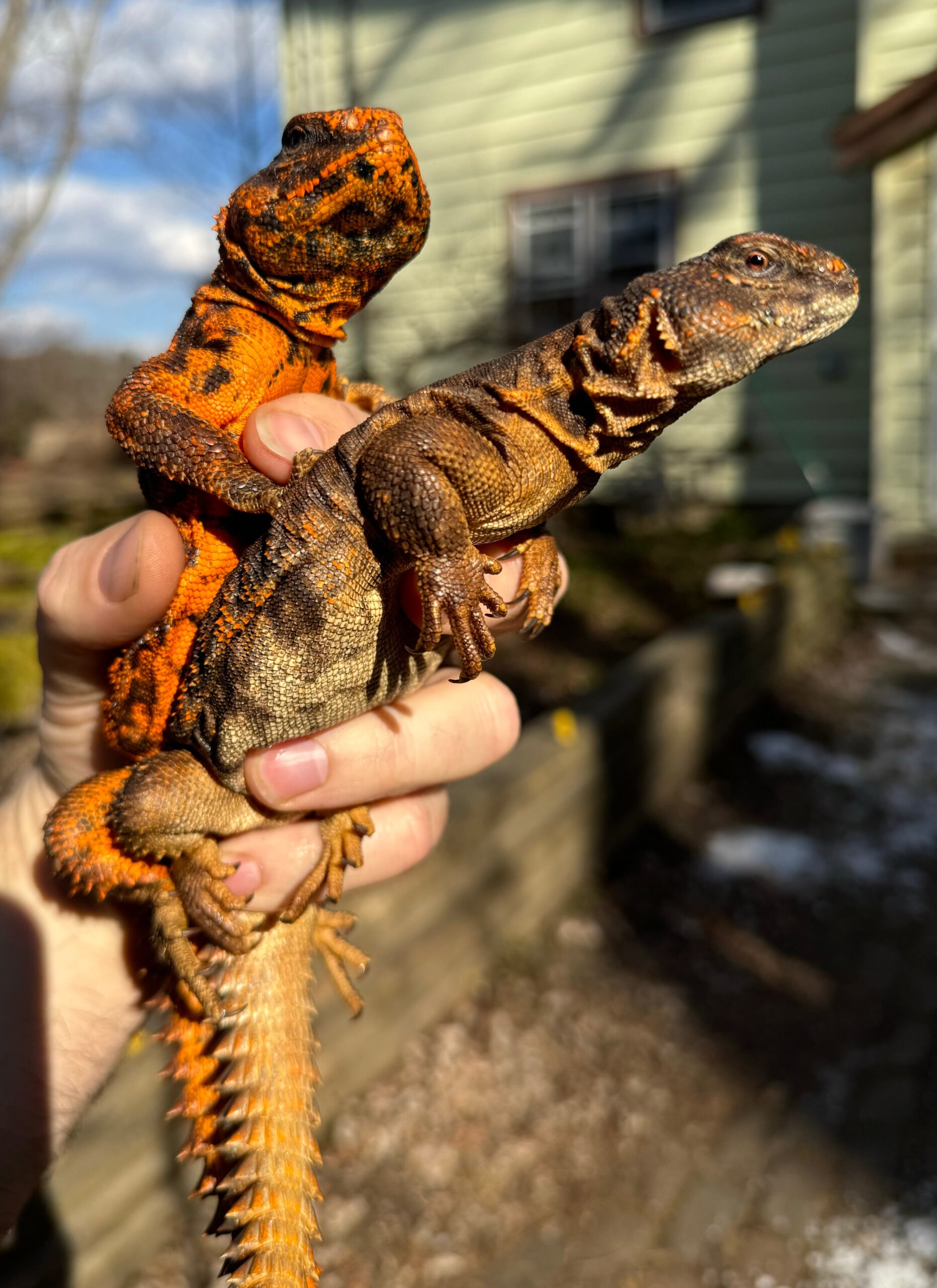 Localreptileshows is a Raleigh, NC-based retailer specializing in high-quality reptiles and herpetoculture supplies. The Red Niger Uromastyx Adult Pair #5 (Uromastyx geyri) is a stunning, captive-bred pair of lizards known for their vibrant coloration and hardy nature. You are purchasing the exact animals pictured. This specific adult pair is available now for $219.99 with same-day shipping.